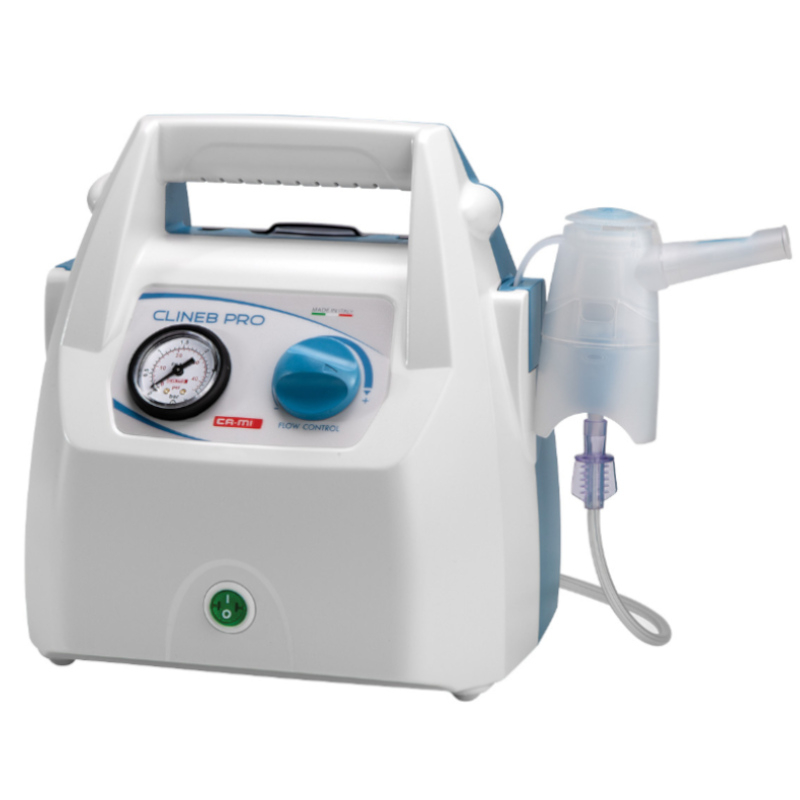 Aparat aerosoli CLINEB PRO, cu compresor, profesional, functionare continua, alimentare: 230V-50Hz; presiunea maxima: 3 bar; presiunea de operare: 0,95 bar; debit de aer maxim: 16 l/min; debit aer operational: 8 l/min; MMAD 3,32-:-4,18 µm; rata nebulizare 0,40-:-0,8ml/min; dimensiuni: 23x19x25 cm; greutate: 2,2 kg; dotare standard: nebulizator HI-4, masca fata de adulti, masca fata de copii, piesa de gura, piesa de nas, tub de legatura, filtru de aer