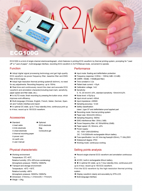 ECG 100G un electrocardiograf digital cu 12 canale si imprimare pe un canal. Printer si acumulator incorporat. Mod de lucru AUTO / MANUAL. Preia semnalul digital si obtine unde ECG de inalta calitate prin intermediul filtrului de baza si a filtrului EMG. Sistem de printare cu inalta rezolutie (8dot/mm). Frecventa de inregistrare: peste 150Hz. Redare in timp real si continua a undelor ECG cu informatii suplimentare (viteza hartiei, starea filtrului, ritmul cardiac, etc.). In modul AUTO terminarea inregistrarii se face prin apasarea unui singur buton. Peste 7 ore de monitorizare, printare continuua peste 4 ore, inregistrare in memorie a peste 150 de unde ECG. Display STN-LCD color.